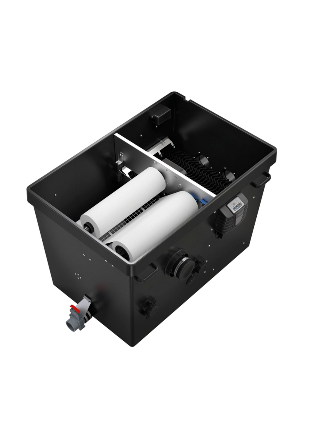 Triple action : Filtration fine, associée à des supports de filtration biologique importants grâce au matériau Hel-X et aux blocs Clear Wave, pour une surface de colonisation encore plus conséquente.